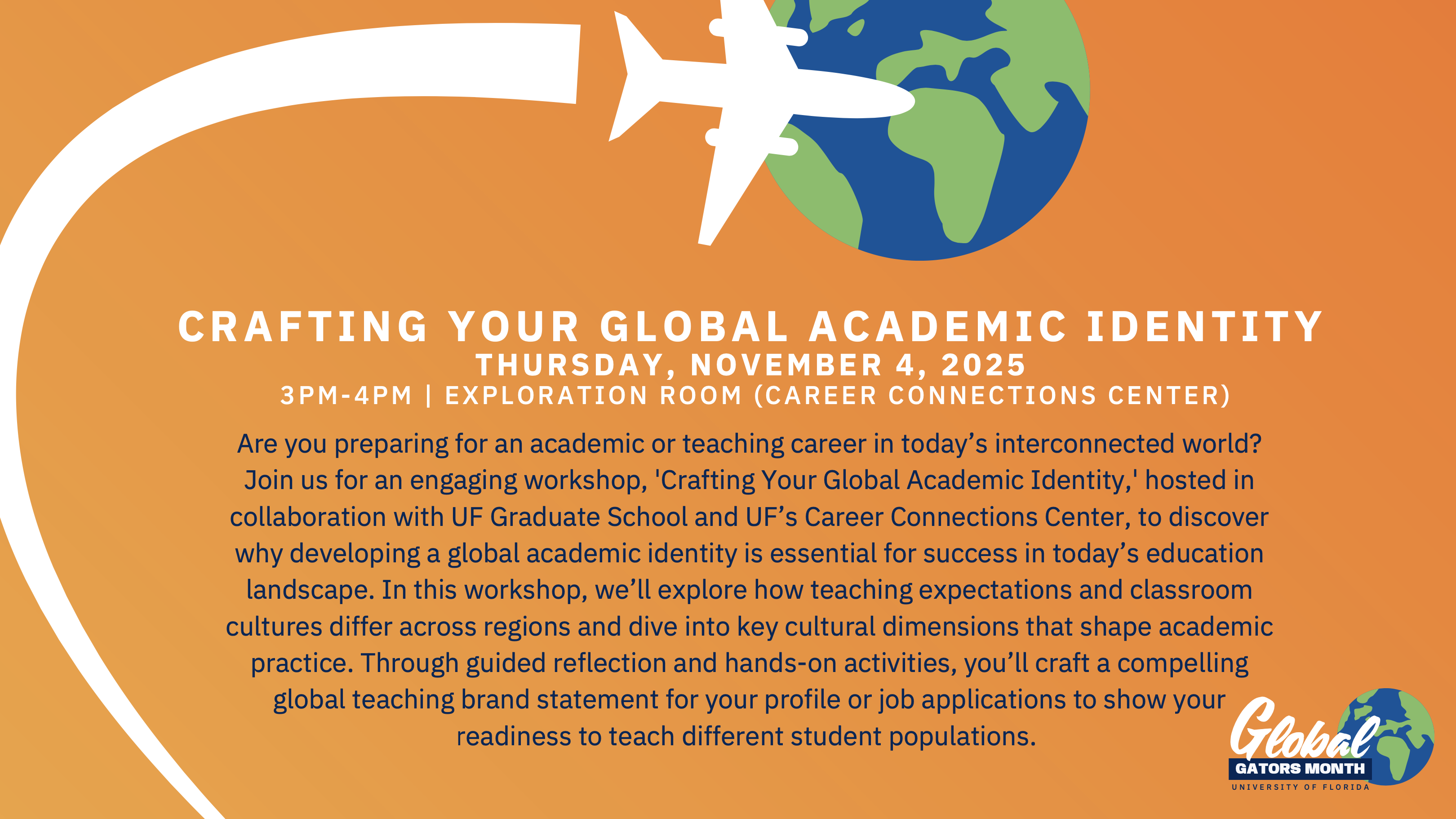 Are you preparing for an academic or teaching career in today’s interconnected world? Join us for an engaging workshop, 'Crafting Your Global Academic Identity,' hosted in collaboration with UF Graduate School and UF’s Career Connections Center, to discover why developing a global academic identity is essential for success in today’s education landscape. In this workshop, we’ll explore how teaching expectations and classroom cultures differ across regions and dive into key cultural dimensions that shape academic practice. Through guided reflection and hands-on activities, you’ll craft a compelling global teaching brand statement for your profile or job applications to show your readiness to teach different student populations.