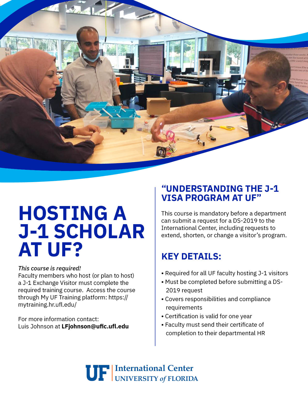 For more information, please contact Luis Johnson, Director of Exchange Visitor Services at the UF International Center.