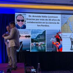 Dr. Arnoldo Valle-Levinson received a recognition from colleagues during the Third Conference of Latin American Physics of Estuaries and Coastal Oceans (LAPECO), held in Puerto Varas, Chile. The recognition highlights his contributions to the field of estuarine and coastal ocean research.