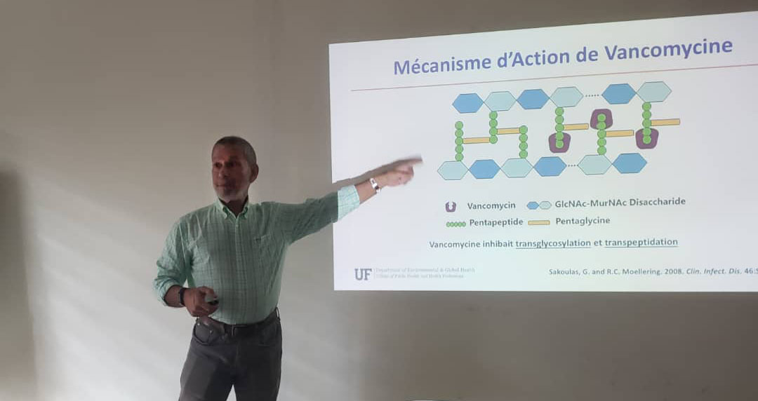 Anthony Maurelli, Ph.D., speaks to trainees about antibiotic resistance during a three-week visit to the Institut Pasteur de Guinée in August and September. Photo courtesy of Anthony Maurelli.