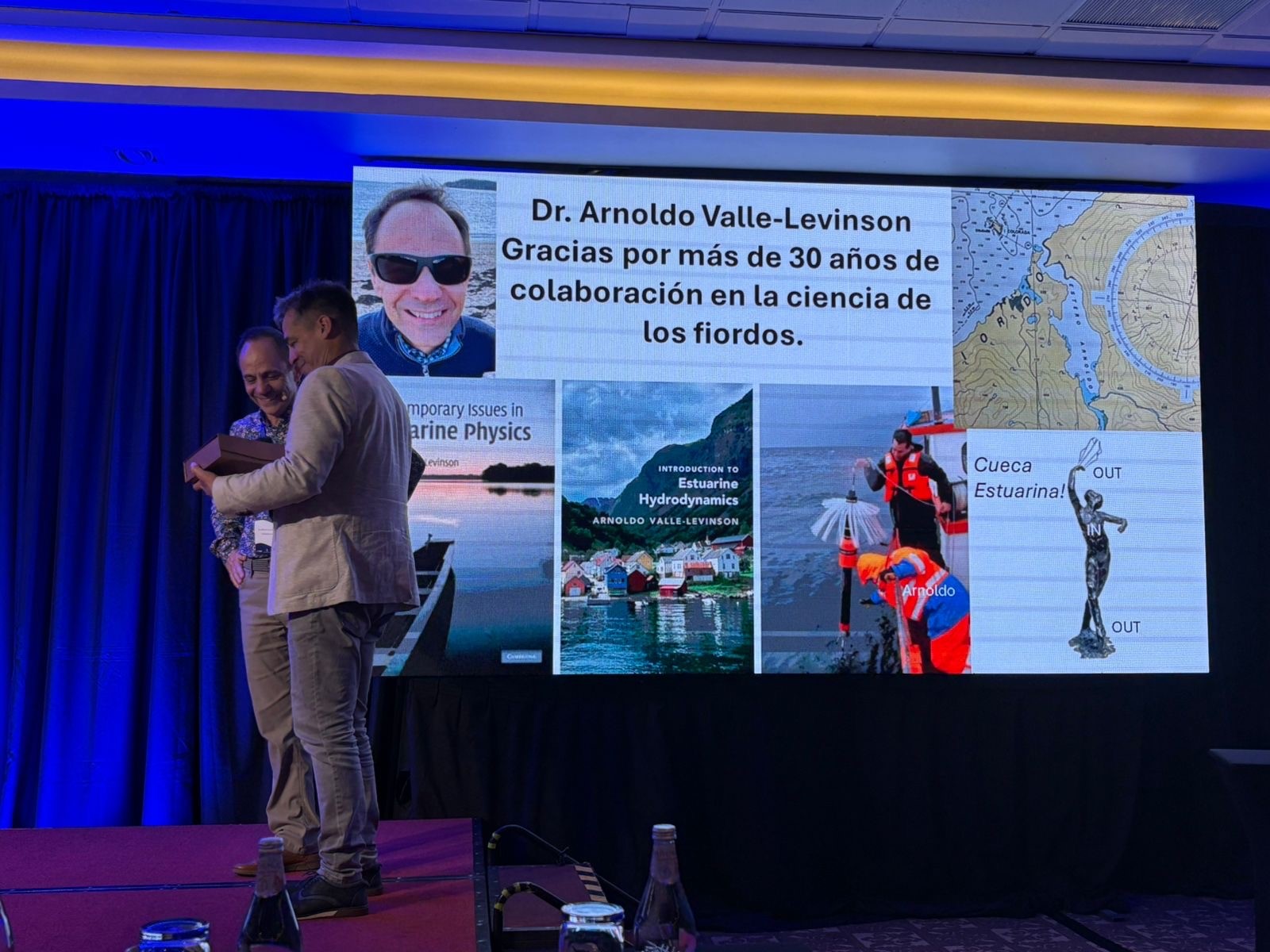 Dr. Arnoldo Valle-Levinson received a recognition from colleagues during the Third Conference of Latin American Physics of Estuaries and Coastal Oceans (LAPECO), held in Puerto Varas, Chile. The recognition highlights his contributions to the field of estuarine and coastal ocean research.