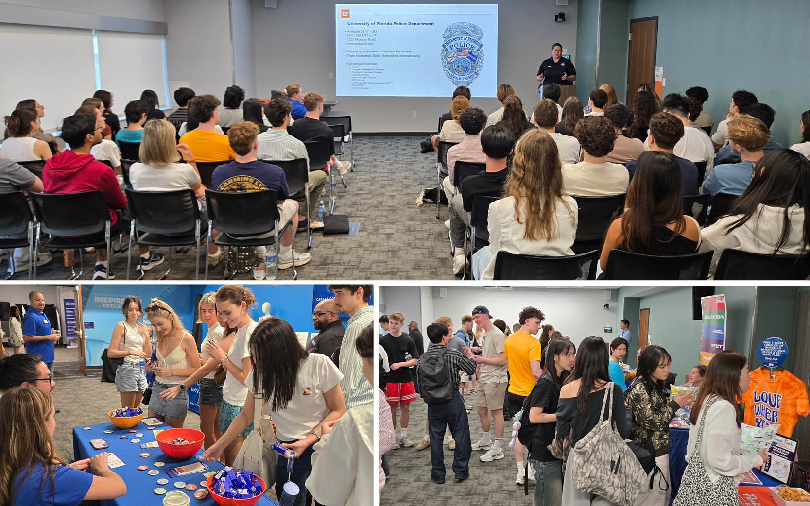The International Center hosted the F-1 Undergraduate and J-1 Exchange Student Orientation and Tabling at the Career Connections Center in the Reitz Union. The program included presentations from campus partners, an overview of F-1 and J-1 regulations, and tabling by partners.